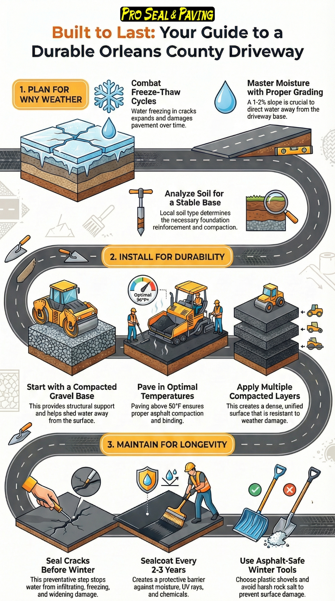 For homeowners in Orleans County, NY whether in Albion, Medina, Lyndonville, Holley, or Waterport a long-lasting residential driveway requires careful planning, knowledge of weather and soil conditions, and a professionally executed asphalt installation. Understanding freeze-thaw effects, drainage challenges, and proper maintenance ensures your driveway stands up to Western New York’s demanding seasonal cycles and enhances safety, performance, and curb appeal.